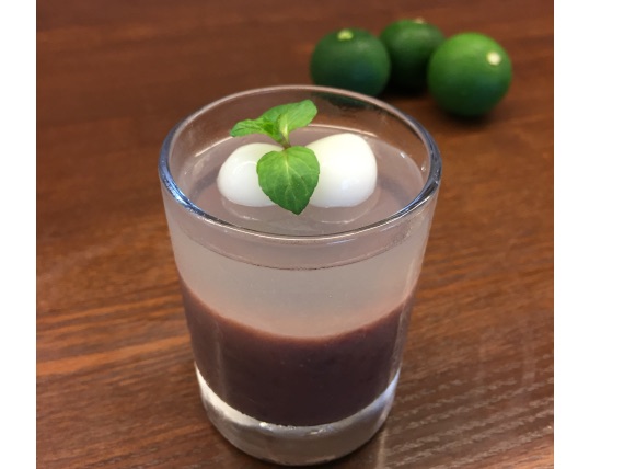 自家製のあんこを水ようかんに仕立て上げ、すだちの果汁をたっぷり絞ったジュレの上にはモチモチの白玉。