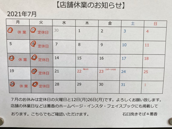7月の休みの予定です